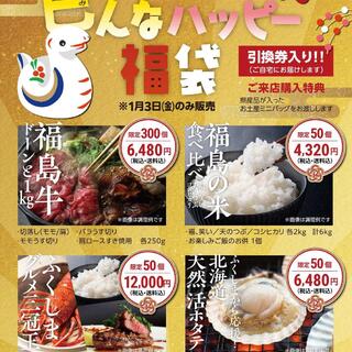 2025年『福島牛ドーンと1kg』福袋は6,480円です。来店購入特典で県産品が入った「お土産ミニバッグ」がもらえます。他にも限定福袋があります。